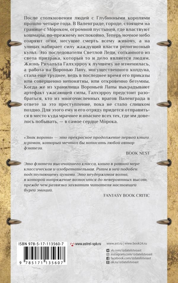 После столкновения людей с Глубинными королями прошло четыре года. В Валенграде, городе, стоящем на границе с Мороком, огромной пустыней, где властвуют кошмары, по-прежнему неспокойно. Теперь ночное небо озаряют огни, несущие смерть всему живому, а на улицах набирает силу жаждущий власти религиозный культ. Это последователи Светлой Леди, сотканного из света призрака, который то и дело является людям. Жизнь Рихальта Галхэрроу к лучшему не изменилась, а работа на Воронью Лапу, могущественного колдуна, стала еще труднее, ведь в последнее время его приказы или совершенно непонятны, или откровенно безумны. Когда же из хранилища Вороньей Лапы выкрадывают артефакт ужасающей силы, Галхэрроу предстоит разобраться, кто из многочисленных врагов Валенграда в ответе за это преступление, пока не стало слишком поздно. Для этого ему и его отряду придется отправиться в место куда мрачнее и опаснее всех тех, где им довелось побывать, — в самое сердце Морока.