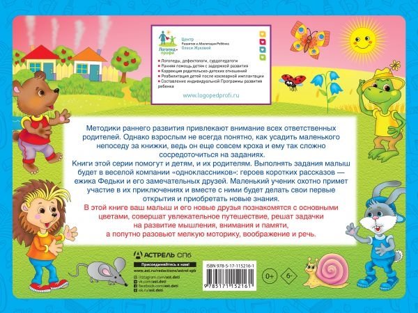 В этой книге каждый блок заданий предварен увлекательным рассказом, герои которого – ежик Федька и его замечательные друзья – познают окружающий мир, приобретают новые знания и решают увлекательные задачки. Занимаясь вместе с ними, ваш малыш ознакомится с основными цветами, разовьет мышление, внимание и память, а также пополнит словарный запас и потренирует мелкую моторику.