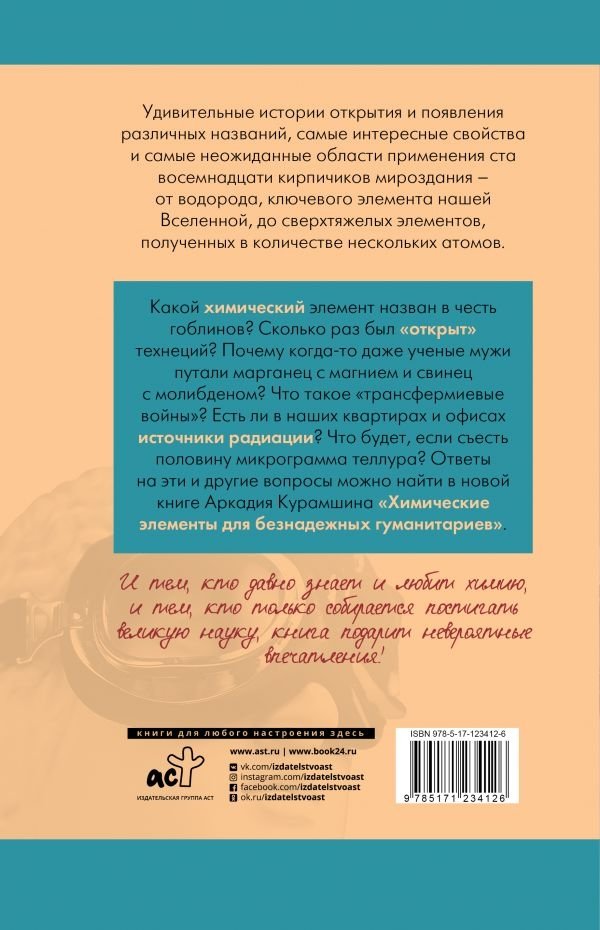 Какой химический элемент назван в честь гоблинов? Сколько раз был «открыт» технеций? Почему когда-то даже ученые мужи путали марганец с магнием и свинец с молибденом? Что такое «трансфермиевые войны»? Есть ли в наших квартирах и офисах источники радиации? Что будет, если съесть половину микрограмма теллура? Ответы на эти и другие вопросы можно найти в новой книге Аркадия Курамшина «Химические элементы для безнадежных гуманитариев».