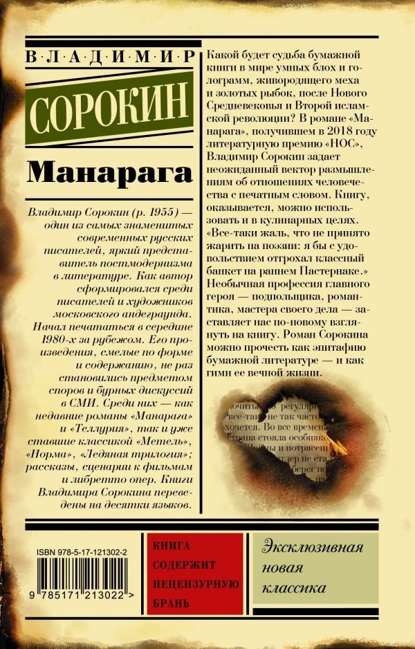 Какой будет судьба бумажной книги в мире умных блох и голограмм, живородящего меха и золотых рыбок, после Нового cредневековья и Второй исламской революции? В романе “Манарага” Владимир Сорокин задает неожиданный вектор размышлениям об отношениях человечества с печатным словом. Необычная профессия главного героя — подпольщика, романтика, мастера своего дела — заставляет нас по-новому взглянуть на книгу. Роман Сорокина можно прочесть как эпитафию бумажной литературе — и как гимн ее вечной жизни.