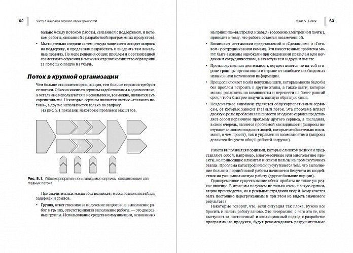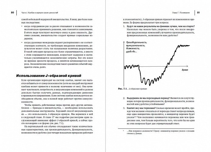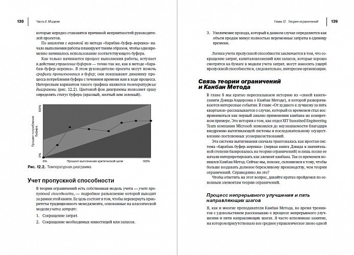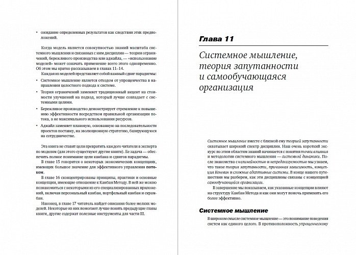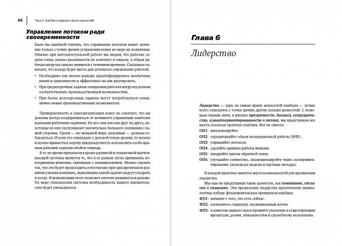 В книге три части. Первая посвящена системе ценностей канбана. Во второй рассказывается о системном мышлении, теории ограничений, аджайле и бережливом производстве — все это необходимо, чтобы лучше понимать принципы канбана. В третьей части даются практически рекомендации по внедрению канбана и рассказывается об основных составляющих метода.