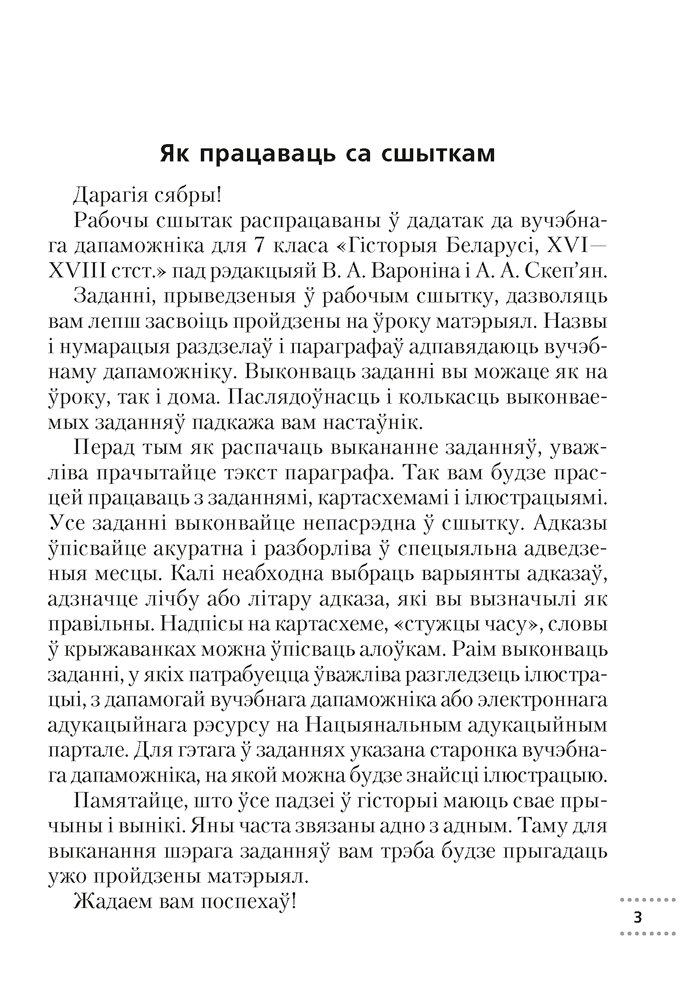 Рабочы сшытак падрыхтаваны ў адпаведнасці з вучэбнай праграмай і вучэбным дапаможнікам па гісторыі Беларусі для 7 класа пад рэдакцыяй В. А. Вароніна і А. А. Скеп’ян. Выданне змяшчае заданні рознага ўзроўню складанасці (цікавыя пытанні, крыжаванкі, заданні на развіццё картаграфічных і храналагічных уменняў), якія дазволяць вучням лепш засвоіць матэрыял. Для зручнасці карыстання карты прадстаўлены ў выглядзе картасхем.