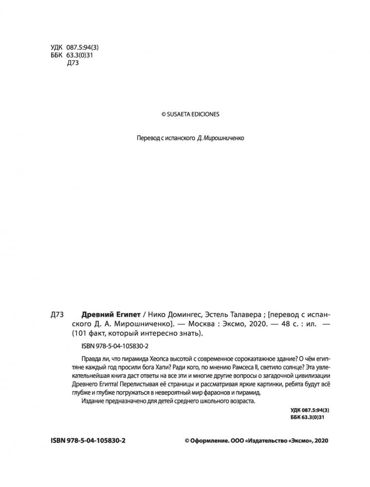 Эта книга станет отличным подарком для ребят, увлекающихся Древним Египтом и стремящихся узнать о нём всё самое интересное. Здесь нет сложных длинных статей и малопонятных терминов — только любопытнейшие факты, изложенные доступным и образным языком, плюс большие яркие изображения пирамид, фараонов и таинственных ритуалов!