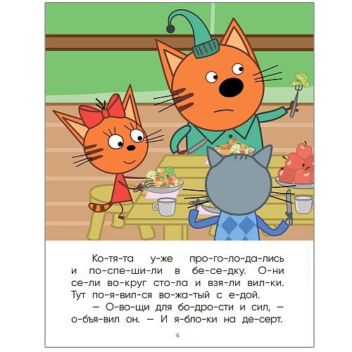 Что делать, если ребенок учится читать, а все сказки и стихи уже зачитаны до дыр? На помощь придет книга «В гостях у Горчицы» из серии «Три кота. Читаю по слогам» — история по мотивам любимого мультфильма. Слова, разделенные на фонетические слоги, крупный шрифт, понятные тексты и яркие иллюстрации — все в этой книге предусмотрено для того, чтобы читать по слогам ребенку было легко и интересно. Удобный формат книг позволит наслаждаться чтением не только дома, но и на прогулке, в пути или в очереди. Из книги «В гостях у Горчицы» ребенок узнает, как назаконченное дело может испортить настроение — и как друзья могут превратить любую скучную работу в веселое приключение.