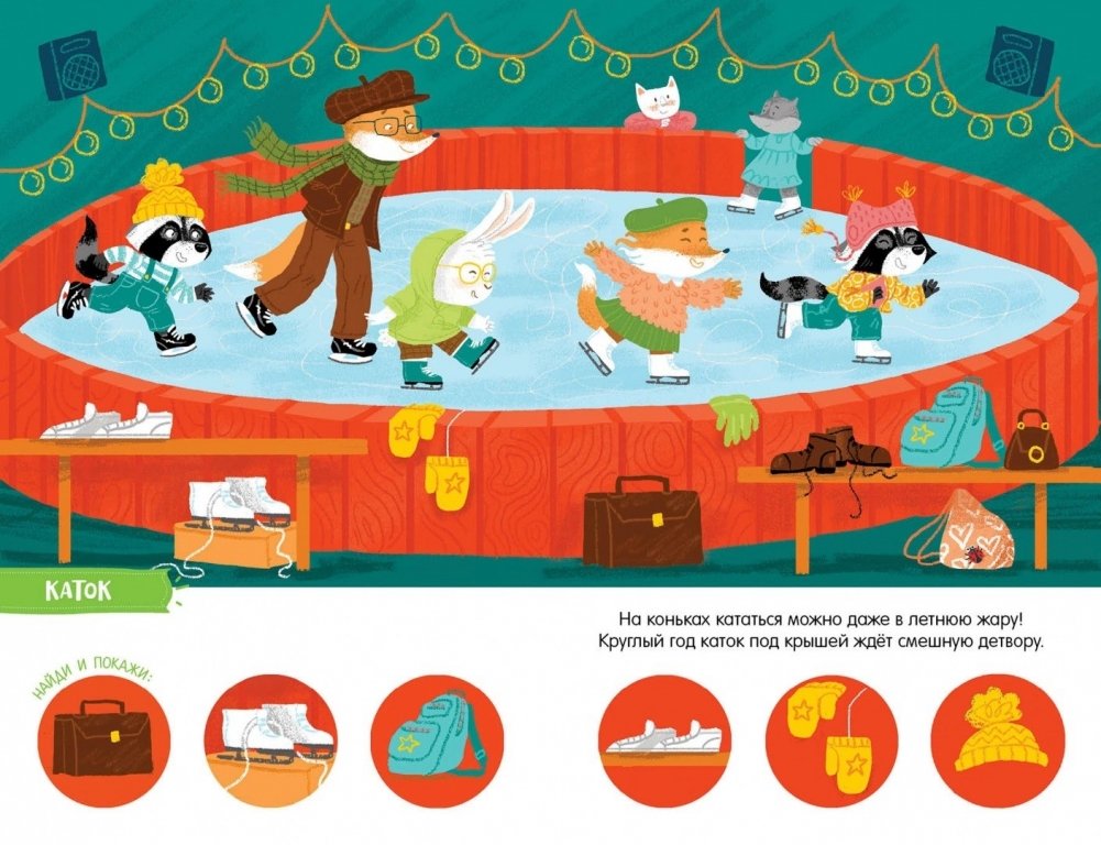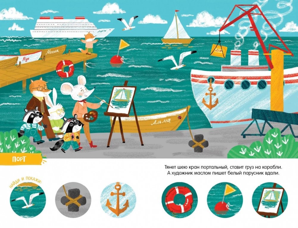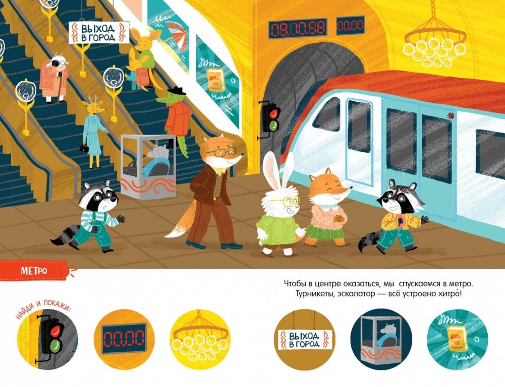Вместе с Лисенком, Зайчонком и Енотиком малышу предстоит прогуляться по большому городу и найти там разные предметы. Он побывает на детской площадке и парке аттракционов, на вокзале и в порту, заглянет на рынок и прокатится в метро, посидит в уличном кафе и узнает, какими разными бывают дома. Играть с книгой очень просто: разглядываем детали, запоминаем, ищем и показываем их на большой картинке. А еще знакомимся с окружающим миром, общаемся и расширяем словарный запас.