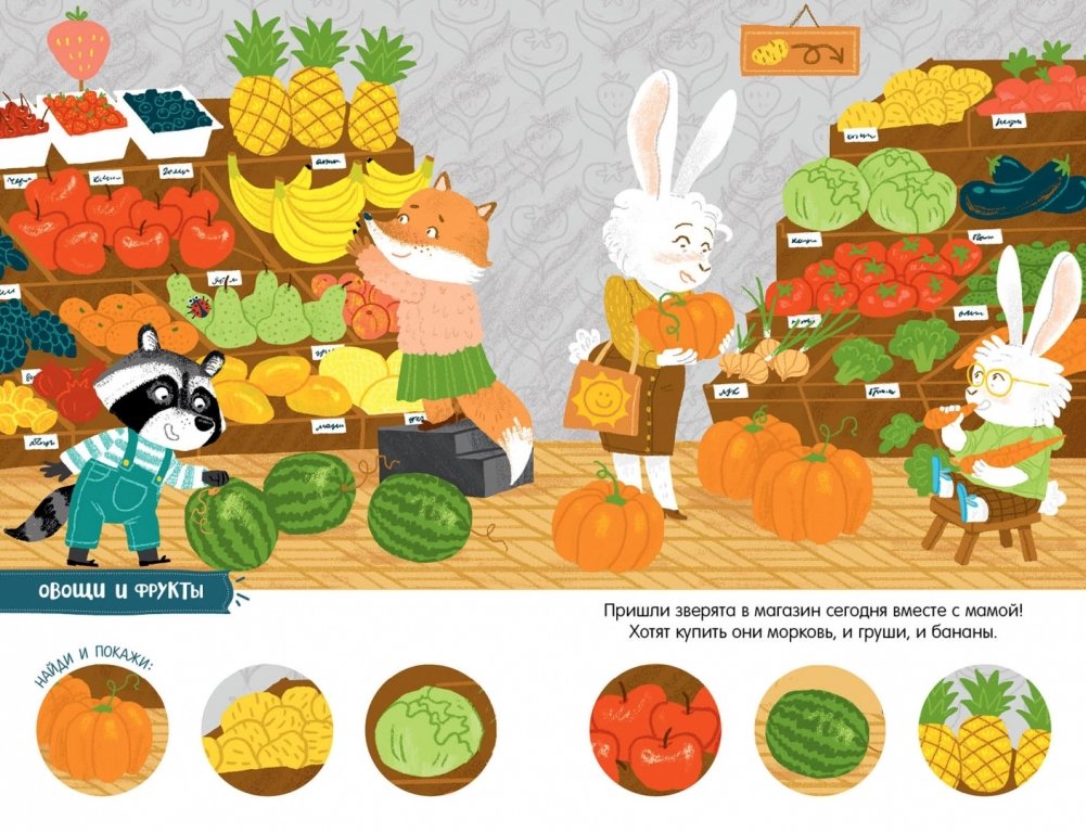 Играть с книгой очень просто: разглядываем детали, запоминаем, ищем и показываем их на большой картинке. А еще знакомимся с окружающим миром, общаемся и расширяем словарный запас.