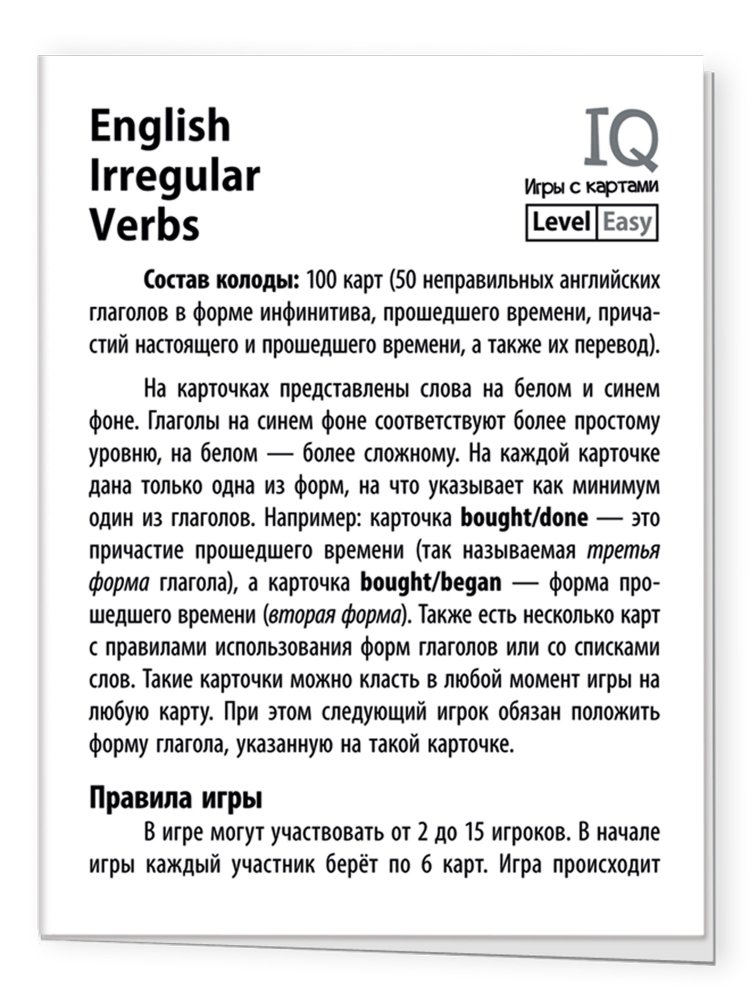 English Irregular Verbs - это целых 6 необычных весёлых игр в слова для 2-15 человек, с их помощью английские глаголы запоминаются легко и быстро. Выкладывайте карты на стол, соединяя разные формы глаголов, рассказывайте короткие истории и проверяйте знания друг друга. Игры помогают запомнить правописание и расширить лексический запас. Они эффективно дополняют школьную программу и помогают в игровой форме закрепить пройденный материал.
