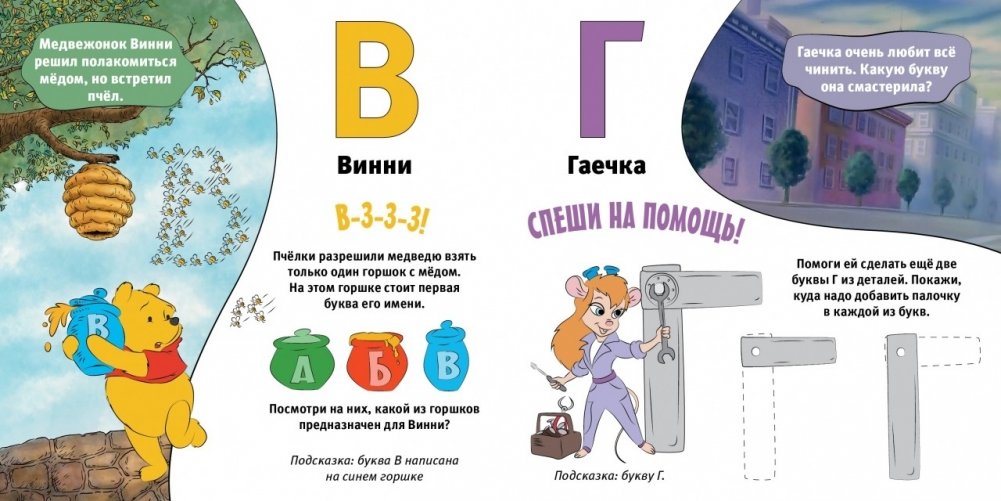 Медальон с какой буквой подарила принцесса Жасмин тигру Радже? В каком горшочке сладкий мед ждет Медвежонка Вини? Как слоненку Дамбо сделать букву Д из облаков? Какая буква сплелась из водорослей на морском дне у рыбки Немо? Веселая и познавательная азбука от Симбы, Гаечки, Лаки и других милых персонажей из мультиков Disney. На каждой странице задания для игр с ребенком и развития мелкой моторики. Крупный текст, яркие иллюстрации!