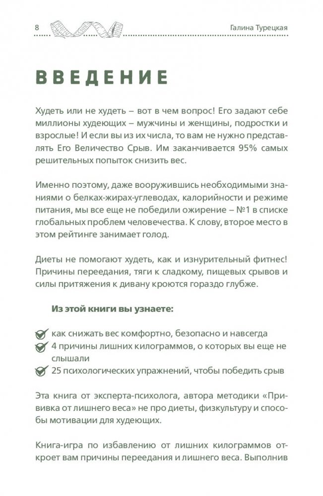 Галина Турецкая – кандидат психологических наук и член Профессиональной Психотерапевтической Лиги поможет вам разобраться в причинах переедания и лишних килограммов. Более 100 000 людей благодаря мощным психологическим практикам смогли побороть пищевые расстройства и снизить вес без диет и тренажеров. Попробуйте изменить вашу жизнь прямо сейчас, ведь она слишком прекрасна, чтобы тратить ее на диеты и срывы!