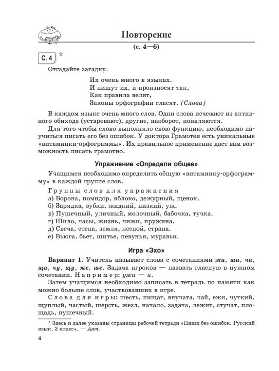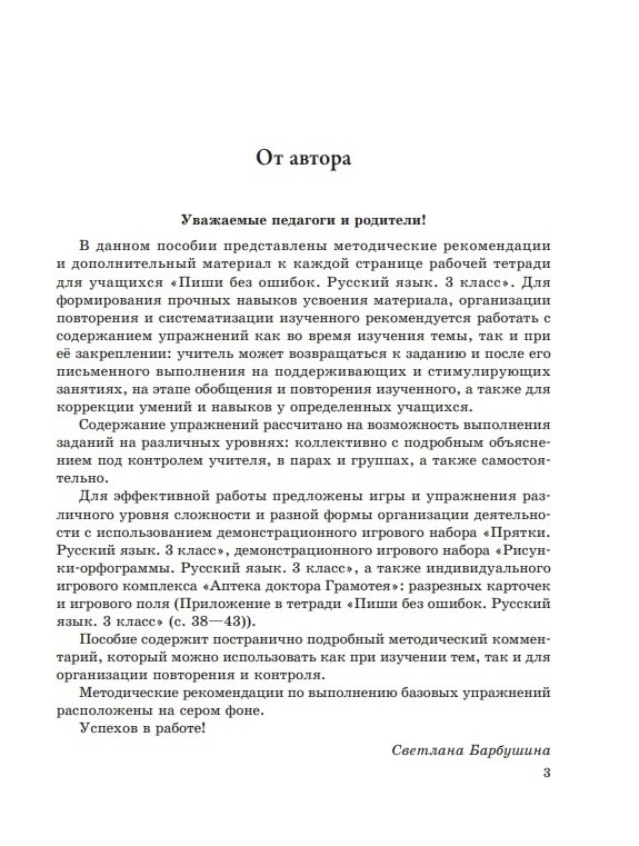 Пособие является частью учебно-методического комплекса «Школа доктора Грамотея». Адресуется учителям, родителям и содержит подробные методические рекомендации, игры и дополнительные упражнения к рабочей тетради «Пиши без ошибок. Русский язык. 3 класс». Они помогут вам в формировании у детей орфографических умений и прочных навыков усвоения изученного материала.