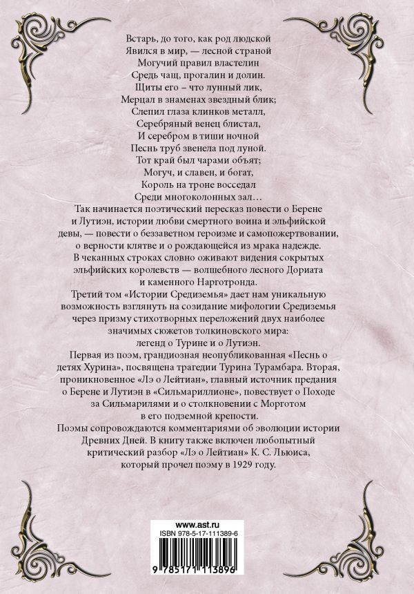 Третий том "Истории Средиземья" дает нам уникальную возможность взглянуть на созидание мифологии Средиземья через призму стихотворных переложений двух наиболее значимых сюжетов толкиновского мира: легенд о Турине и о Лутиэн. Первая из поэм, грандиозная неопубликованная "Песнь о детях Хурина", посвящена трагедии Турина Турамбара. Вторая, проникновенное "Лэ о Лейтиан", главный источник предания о Берене и Лутиэн в "Сильмариллионе", повествует о Походе за Сильмарилями и о столкновении с Морготом в его подземной крепости. Поэмы сопровождаются комментариями об эволюции истории Древних Дней. В книгу также включен любопытный критический разбор "Лэ о Лейтиан" К.С. Льюиса, который прочел поэму в 1929 году.