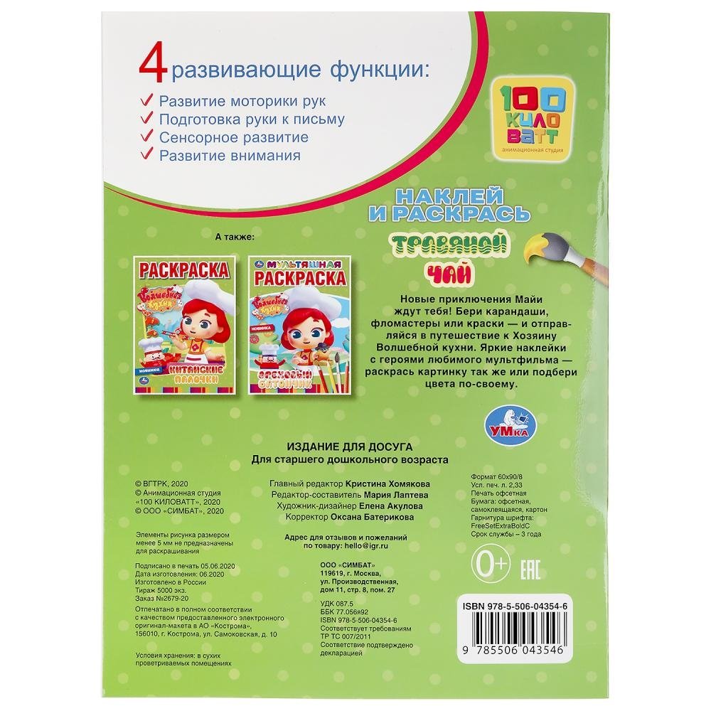 Раскраска «Волшебная кухня. Травяной чай» из серии «Наклей и раскрась» ТМ «УМка» приглашает детей порисовать: