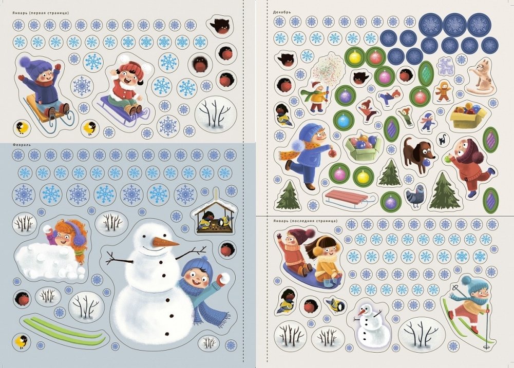 В ней вы найдёте 12 ярких тематических фонов каждого календарного месяца: январь, февраль, март, апрель и т.д., более 600 красочных наклеек, которые помогут ребёнку создавать собственные картины и познакомят с четырьмя сезонами: зима, весна, лето и осень, а также 12 стихов о временах года для развития речи и кругозора.