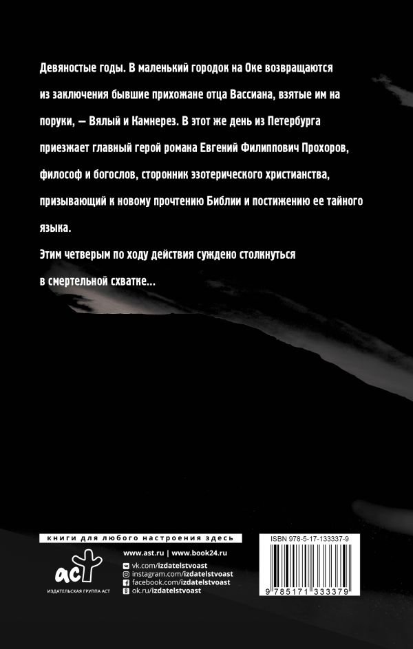 Девяностые годы. В маленький городок на Оке возвращаются из заключения бывшие прихожане отца Вассиана, взятые им на поруки, - Вялый и Камнерез. В этот же день из Петербурга приезжает главный герой романа Евгений Филиппович Прохоров, философ и богослов, сторонник эзотерического христианства, призывающий к новому прочтению Библии и постижению ее тайного языка. Этим четверым по ходу действия суждено столкнуться в смертельной схватке.