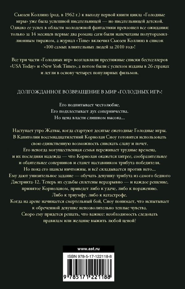 Ему дают унизительное задание — обучать девушку-трибута из самого бедного Дистрикта-12. Теперь их судьбы сплетены неразрывно — и каждое решение, принятое Кориоланом, приведет либо к удаче, либо к поражению. Либо к триумфу, либо к катастрофе.