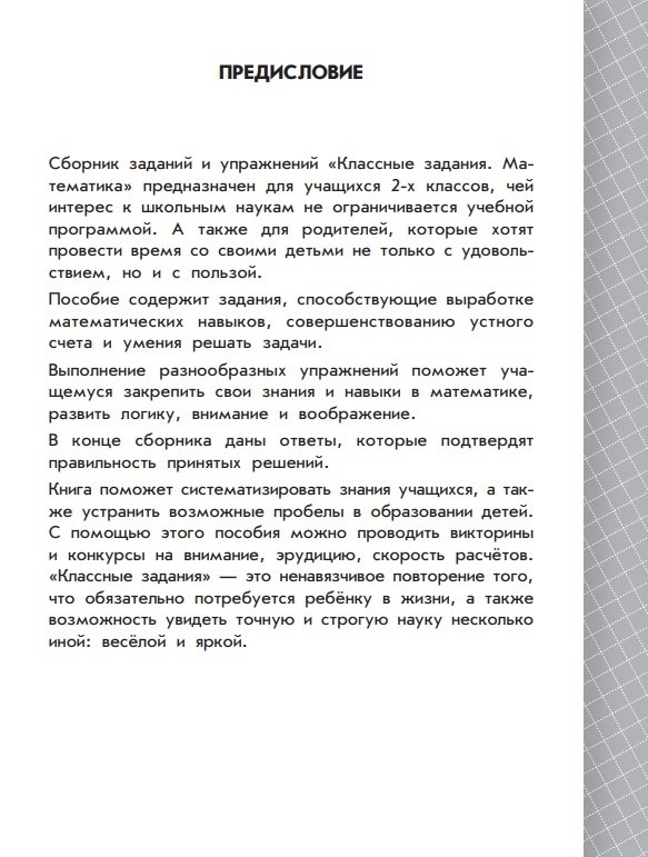 Пособие, соответствующее ФГОС, поможет учащимся 2 класса в занимательной форме закрепить навыки, полученные в школе, развить математические способности и математическое мышление, потренировать логику и внимание, а также повысить уровень IQ, улучшить успеваемость по предмету, интересно и с пользой провести время. Сборник может быть использован в качестве дополнительного материала в школе, для индивидуальной работы дома, для повторения знаний во время каникул.