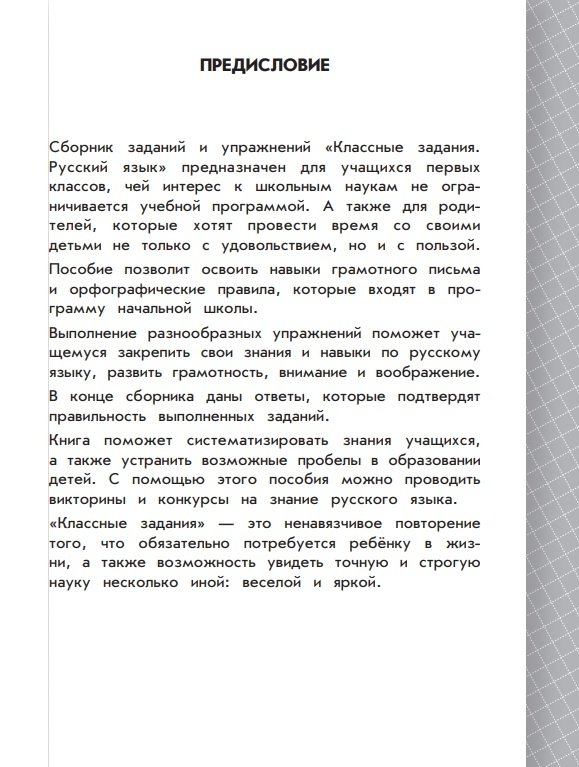 Пособие, соответствующее ФГОС, поможет учащимся 1 класса в занимательной форме закрепить навыки грамотного письма, развить орфографическую зоркость, потренировать логику и внимание, а также повысить уровень IQ, улучшить успеваемость по предмету, интересно и с пользой провести время. Сборник может быть использован в качестве дополнительного материала в школе, для индивидуальной работы дома, для повторения знаний во время каникул.