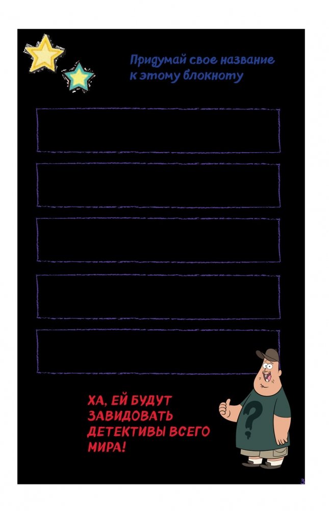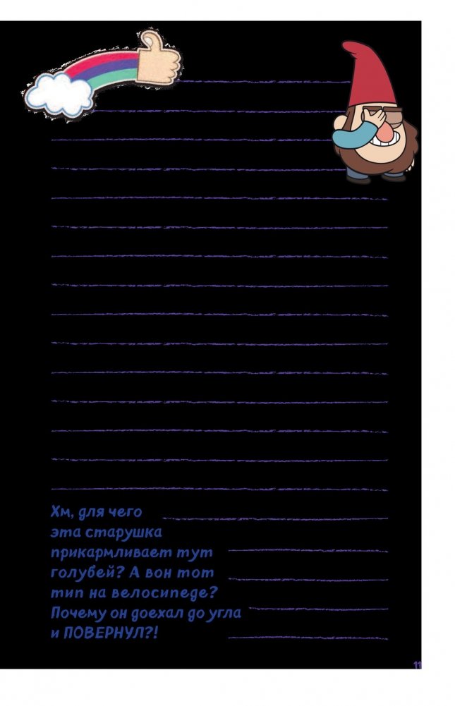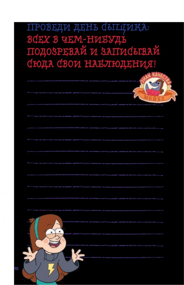 Отвлеките ребенка от телевизора или планшета с помощью Гравити Фолз! Все, что нужно, уже внутри блокнота. Задания, квесты, рисовалки и бродилки, осталось только включить фантазию и проявить себя. Можно устроить крутой челендж и посоревноваться с друзьями, кто интереснее выполнит задание! Мейбл и Диппер уже ждут, чтобы отправиться с читателем в приключение по страницам этого блокнота!