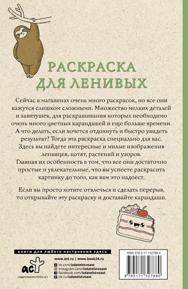 Сейчас в магазинах очень много раскрасок, но все они кажутся слишком сложными. Множество мелких деталей и завитушек, для раскрашивания которых необходимо очень много цветных карандашей и еще больше времени. А что делать, если хочется отдохнуть и быстро увидеть результат? Тогда эта раскраска специально для вас. Здесь вы найдете интересные и милые изображения ленивцев, котят, растений и узоров. Главная их особенность в том, что все они достаточно простые и увлекательные, что вы успеете раскрасить картинку до того, как вам это надоест.