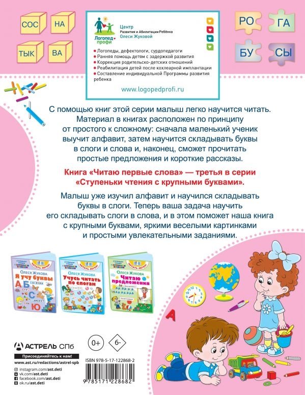 Книга "Читаю первые слова" – третья в серии "Ступеньки чтения с крупными буквами". Малыш уже изучил алфавит и научился складывать буквы в слоги. Теперь ваша задача научить его складывать слоги в слова, и в этом поможет наша книга с крупными буквами, яркими веселыми картинками и простыми увлекательными заданиями.