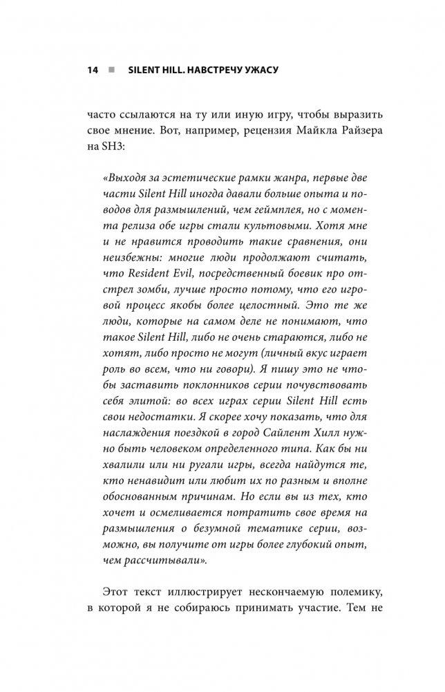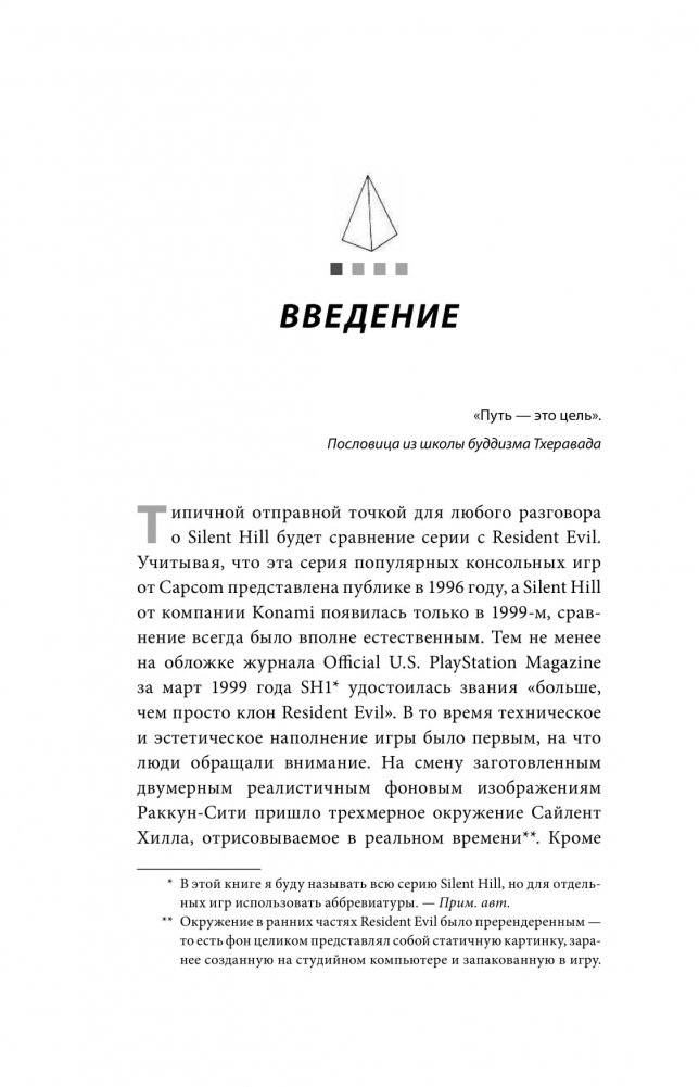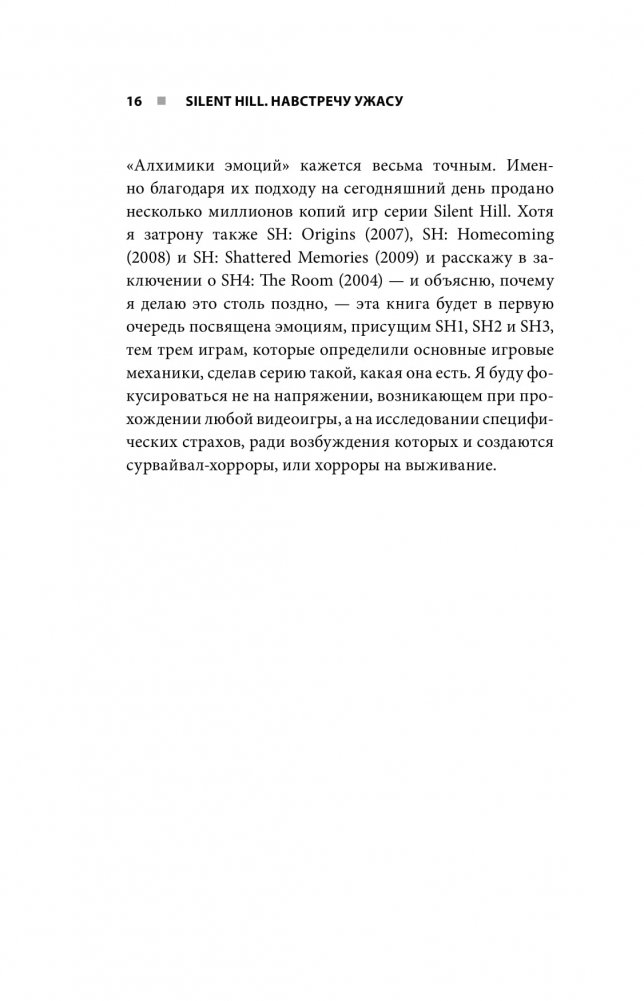 Silent Hill – горячо любимая многими серия игр в жанре сурвайвал-хоррор, плотно закрепившаяся в массовой культуре. О ней наслышаны даже далекие от мира видеоигр люди. Но в чем причина этой популярности? Бернар Перрон слой за слоем деконструирует техники и приемы знаменитой серии, которая околдовывают игроков, заставляя их сердца биться чаще. Вы узнаете, как визуальная составляющая, звуки, музыка, игровые механики, построение игрового повествования и многие другие компоненты создают незабываемый игровой опыт, а также почему, несмотря на испытываемые ужас и страх, игроки получают огромное удовольствие от прохождения Silent Hill.