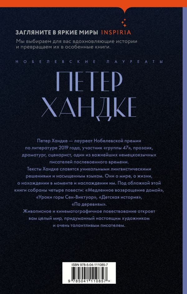 Петер Хандке — лауреат Нобелевской премии по литературе 2019 года, участник "группы 47", прозаик, драматург, сценарист, один из важнейших немецкоязычных писателей послевоенного времени. Тексты Хандке славятся уникальными лингвистическими решениями и насыщенным языком. Они о мире, о жизни, о нахождении в моменте и наслаждении им. Под обложкой этой книги собраны четыре повести: "Медленное возвращение домой", "Уроки горы Сен-Виктуар", "Детская история", "По деревням". Живописное и кинематографичное повествование откроет вам целый мир, придуманный настоящим художником и очень талантливым писателем.