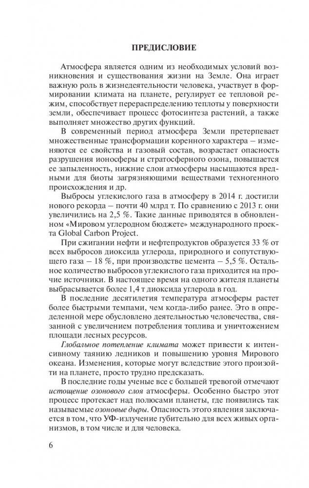 Описаны основные принципы и направления охраны атмосферного воздуха, процессы, протекающие в атмосфере при поступлении в нее загрязняющих веществ и их рассеивании. Рассмотрены вопросы нормирования и инвентаризации выбросов в атмосферу, государственного регулирования, учета и контроля; очистки, обезвреживания, обеззараживания и дезодорации газовоздушных выбросов, защиты воздушного бассейна от механических, химических и физических воздействий. Особое место в изучении средств защиты атмосферного воздуха отводится правовым, организационным, санитарно-техническим, градостроительным и другим методам. Представлены действующие законодательные и другие нормативные правовые акты по охране атмосферного воздуха.