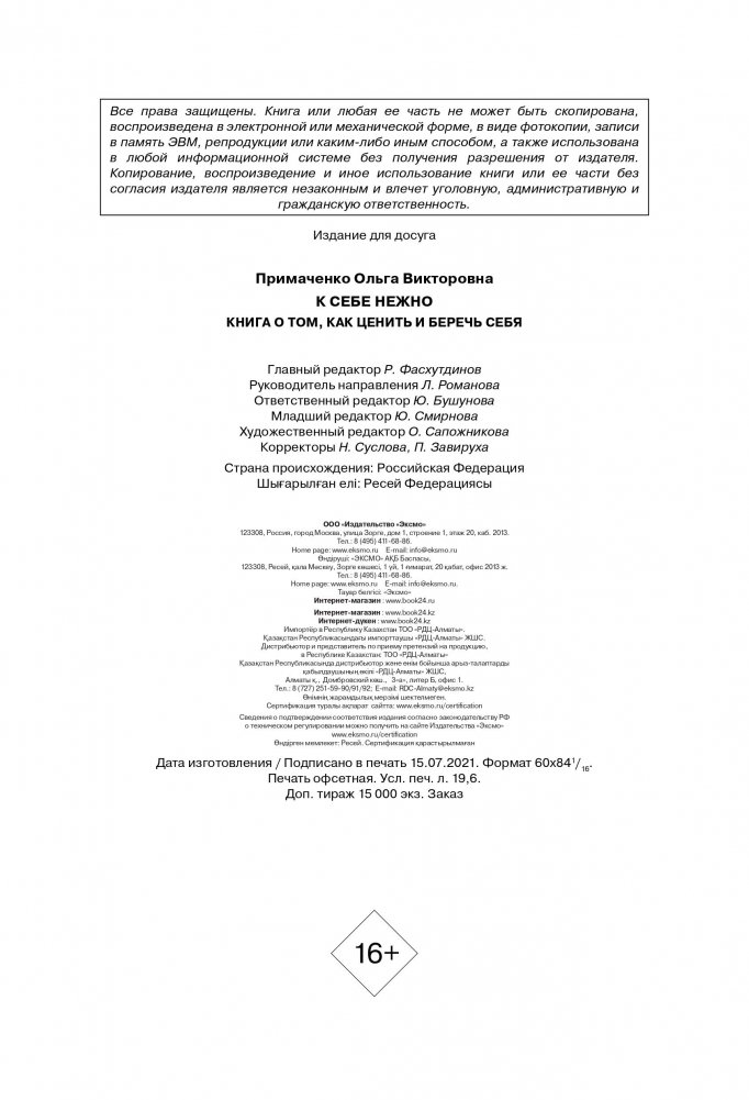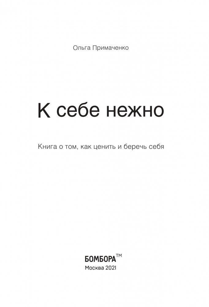"К себе нежно" — это новый, очень честный взгляд на любовь к себе. Это книга-медитация, которая призывает к внутреннему разговору и помогает услышать собственный голос среди множества других. Автор книги Ольга Примаченко — журналист, экс-главный редактор LADY.TUT.BY и автор блога Gnezdo.by — говорит с читателем о важном: о принятии своих чувств, желаний и тела, о расставлении приоритетов и границ, о создании питательного пространства вокруг себя, а также об экологичном взаимодействии с миром и людьми. В конце книги читателя ждет 31-дневная практика нежности к себе.