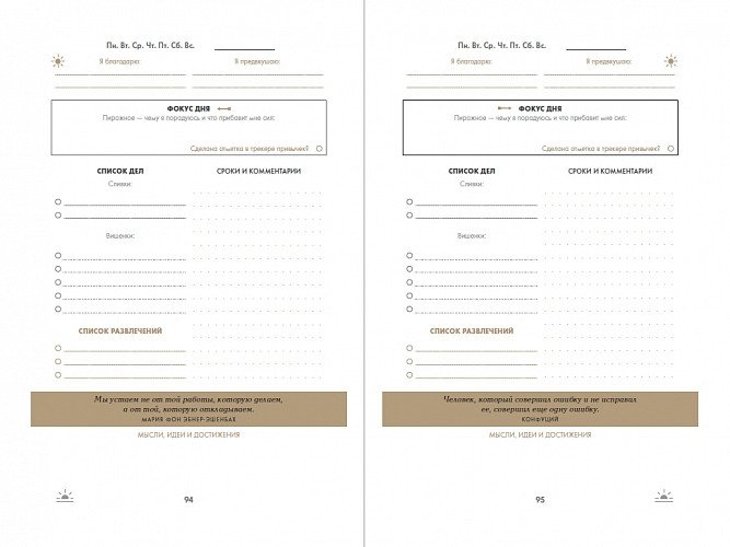 Структуре дневника хорошо продумана: вы отфильтровываете задачи, концентрируетесь на тех, которые имеют положительное влияние на вашу жизнь. Тем самым преследуете истинные цели и на вас не действуют отвлекающие факторы. Скажите «нет» суете и хаосу и «да» ясности и внутреннему спокойствию.