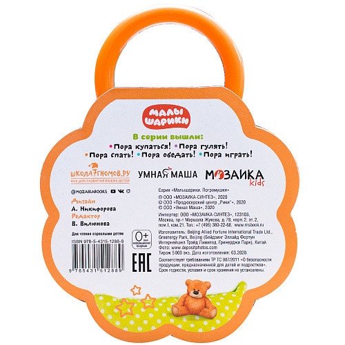 Книга «Пора спать!» из серии «Малышарики. Погремушки» предназначена для знакомства с окружающим миром, развития речи и мышления у самых маленьких. В книге ребенок найдет 9 красочных фотографий предметов, окружающих его во время подготовки ко сну (кроватка, подушка, одеяло, пижама, ночник и пр.). Рассматривая их, малыш познакомится с полезными предметами и пополнит свой словарный запас. Книга-игрушка изготовлена из плотного картона и безопасной пены EVA, имеет удобный формат — ее легко держать в руках, можно взять в поездку или в гости.