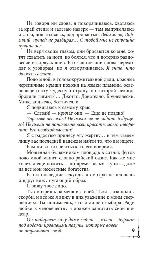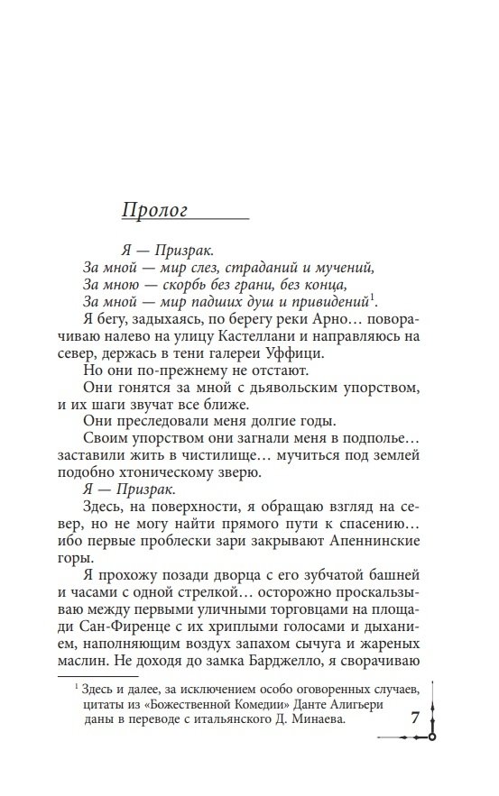 …Оказавшись в самом загадочном городе Италии – Флоренции, профессор Лэнгдон, специалист по кодам, символам и истории искусства, неожиданно попадает в водоворот событий, которые способны привести к гибели все человечество… И помешать этому может только разгадка тайны, некогда зашифрованной Данте в строках бессмертной эпической поэмы…