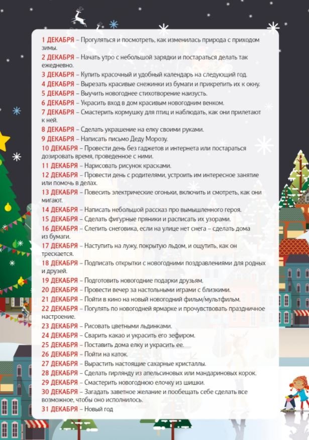 Перед вами не обычный адвент-календарь, а с сюрпризом: вместо классических окошек – серебристый скретч-слой, под которым кроются веселые и интересные задания. Каждый день, начиная с 1 декабря, стирайте один кружочек, выполняйте рекомендацию, которую под ним найдете, и наслаждайтесь праздничным настроением. Теперь ожидание Нового года станет приятным и веселым!