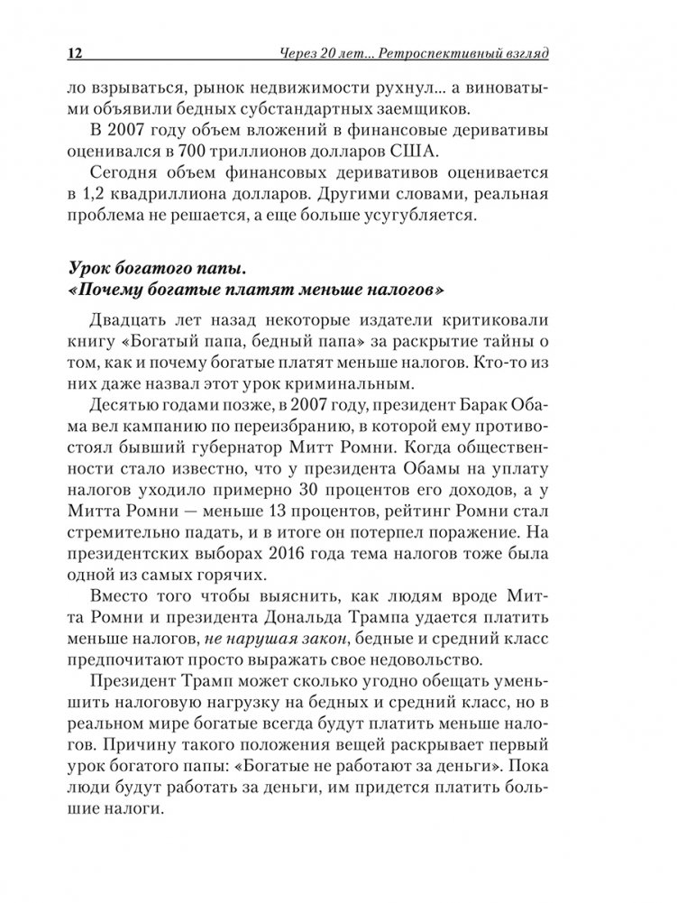 Роберт Кийосаки убежден, что в школе наши дети не получают нужных финансовых знаний и потом всю жизнь работают ради денег, вместо того чтобы заставить деньги работать на себя. Он порадовал читателей новым изданием ставшей уже культовой книги — с изменениями и дополнениями для сегодняшнего мира, сегодняшних рыночных условий и 9 новыми разделами. К сожалению, в сфере образования мало что поменялось — школа до сих пор не дает подрастающему поколению финансовых азов. Научите детей обращаться с деньгами раньше, чем они столкнутся с материальными трудностями в нашем нестабильном мире!