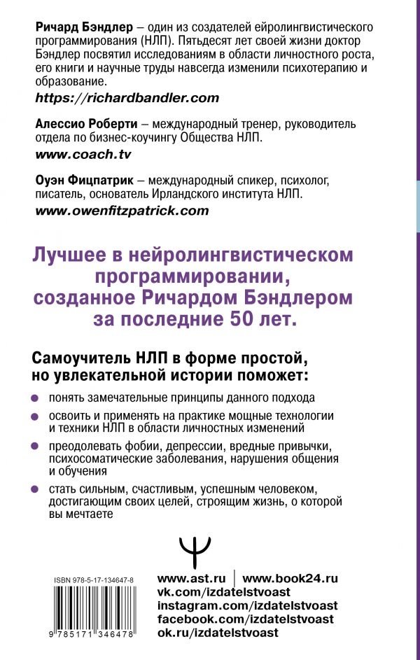 Самоучитель НЛП Ричарда Бэндлера – это изложение основ НЛП в форме простой, но увлекательной истории. Вы сможете окунуться в атмосферу семинаров мастера НЛП и из первых рук узнать о простых техниках, которые он разработал за последние 50 лет.