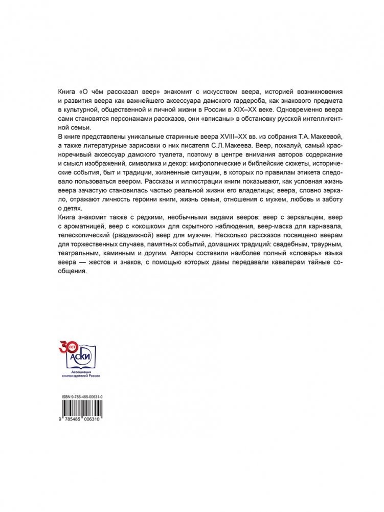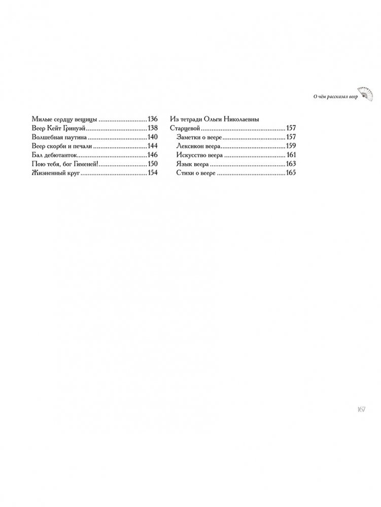 Книга "О чём рассказал веер" - это сборник рассказов о веерах. Писатель Сергей Макеев и коллекционер Татьяна Макеева представили веера из своего собрания; в каждом сюжете веер служит своего рода зеркалом, в котором отразились образ главной героини, ее семья, родные и друзья, а также культура, быт, традиции и нравы в России конца XIX - начала XX века.