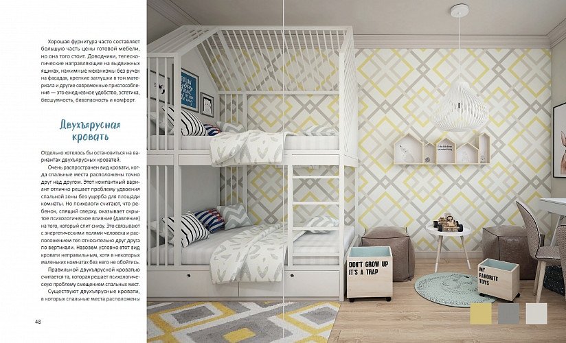 выбрать подходящую мебель; без проблем разместить в одной комнате детей разного пола и возраста; подобрать цвета для детской и правильно их использовать; сделать комнату не только безопасным, но и развивающим пространством; создать такую детскую, которую будет легко переделывать по мере взросления ребенка.