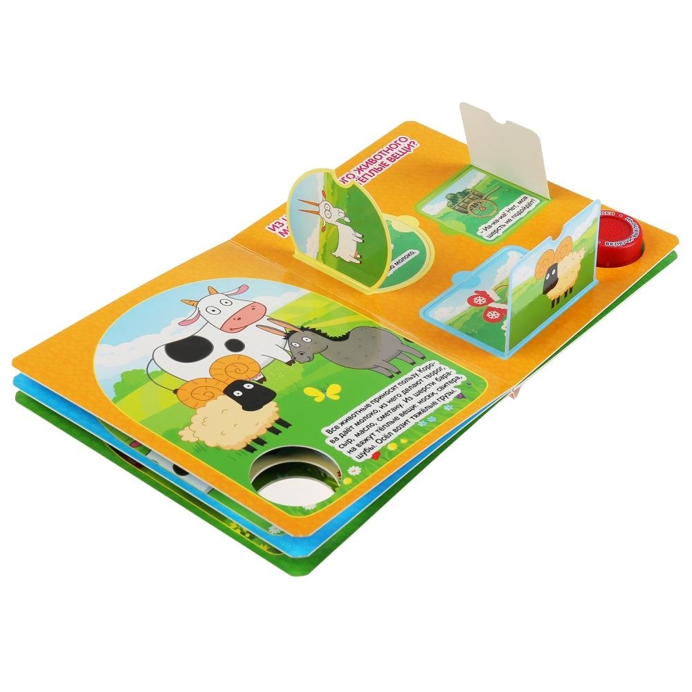 Ребёнок с удовольствием будет листать плотные страницы, рассматривать яркие картинки, открывать окошки и смотреть, кто там спрятался, а также нажимать на кнопку и слушать весёлые песенки. Малыш легко освоит включение звука: по нажатию на кнопку включится первая песенка, при втором нажатии выключится, в 3-ий раз - заиграет следующая песенка и т.д. Благодаря компактному формату книгу удобно взять с собой в дорогу.