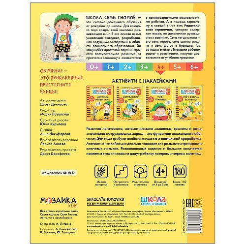 Книга «Счет, форма, величина 4+» из серии «Школа Семи Гномов. Активити с наклейками» предназначена для формирования и развития у детей от 4 до 5 лет элементарных математических представлений, способности измерять величину предметов, определять их форму.