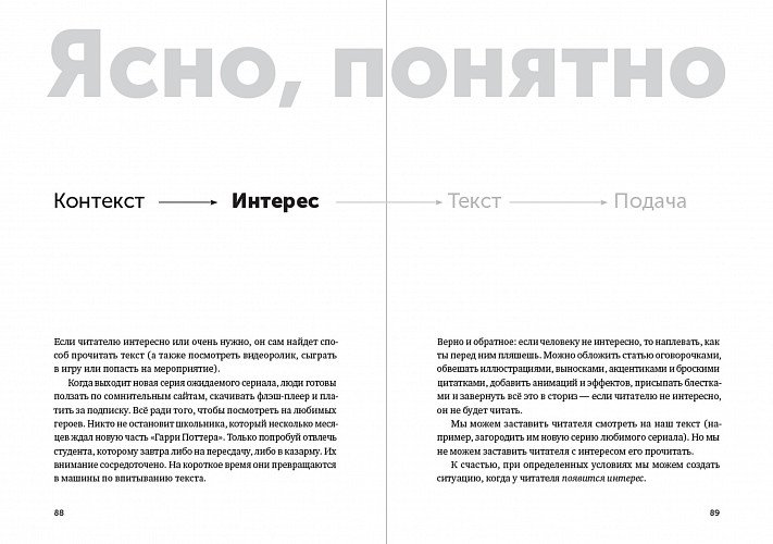 Вы найдете в книге более 50 инструментов улучшения текста. В разделе «Контекст» автор покажет, как справиться с предвзятостью читателей и настроить их на верное восприятие информации. В разделе «Интерес» — как превратить скучный текст в увлекательный, не меняя его содержания. Раздел «Текст» посвящен использованию примеров, антипримеров, аналогий, метафор, сюжетности и слоганов — тому, что поможет адресату правильно понять написанное вами. В разделе «Подача» представлены инструменты мгновенного воздействия: как донести главное заголовком, схемой или фотографией.