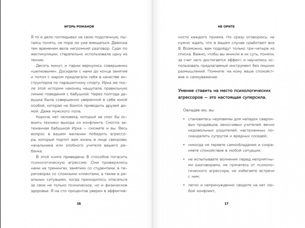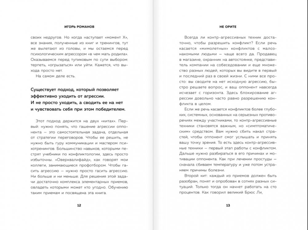 Выходить победителем из любой перепалки. Гасить конфликт парой фраз. Доброжелательно отстаивать свои границы и превращать врагов в хороших приятелей. Этому учит книга, написанная врачом-психиатром, психологом с тридцатилетним стажем, деканом факультета коммуникативного менеджмента РГСУ, бизнес-тренером Игорем Романовым. Он предлагает 8 проверенных техник, которые помогут свести на нет психологическую агрессию и дать возможность перейти к конструктивным переговорам.
