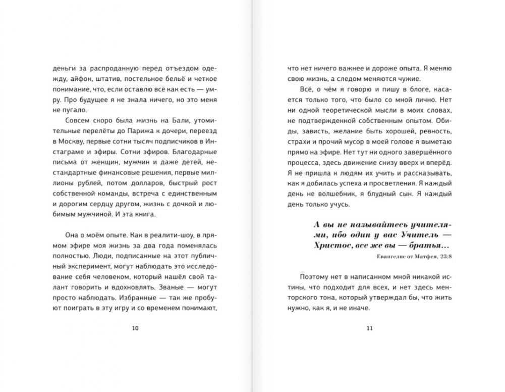 "В этой книге, несмотря на название, нет ничего про религию или церковь. В ней нет правил, канонов, обрядов, списков или инструкций. Человек устроен так тонко, что его нельзя осчастливить массово, дав готовые решения или выстроенные психологические схемы. У каждого свой набор обид и претензий к миру. Я написала о том, что человек только сам способен себя изменить и только в том случае, если он по‑настоящему этого хочет, а не хочет этого хотеть. Любовь к себе нужна не всем, как и эта книга. Кому‑то необходимо жить с долгами и страхами, чтобы не столкнуться лицом к лицу с самим с собой. Желаю не потерять зря времени, прочитав её. До встречи в моем мире."