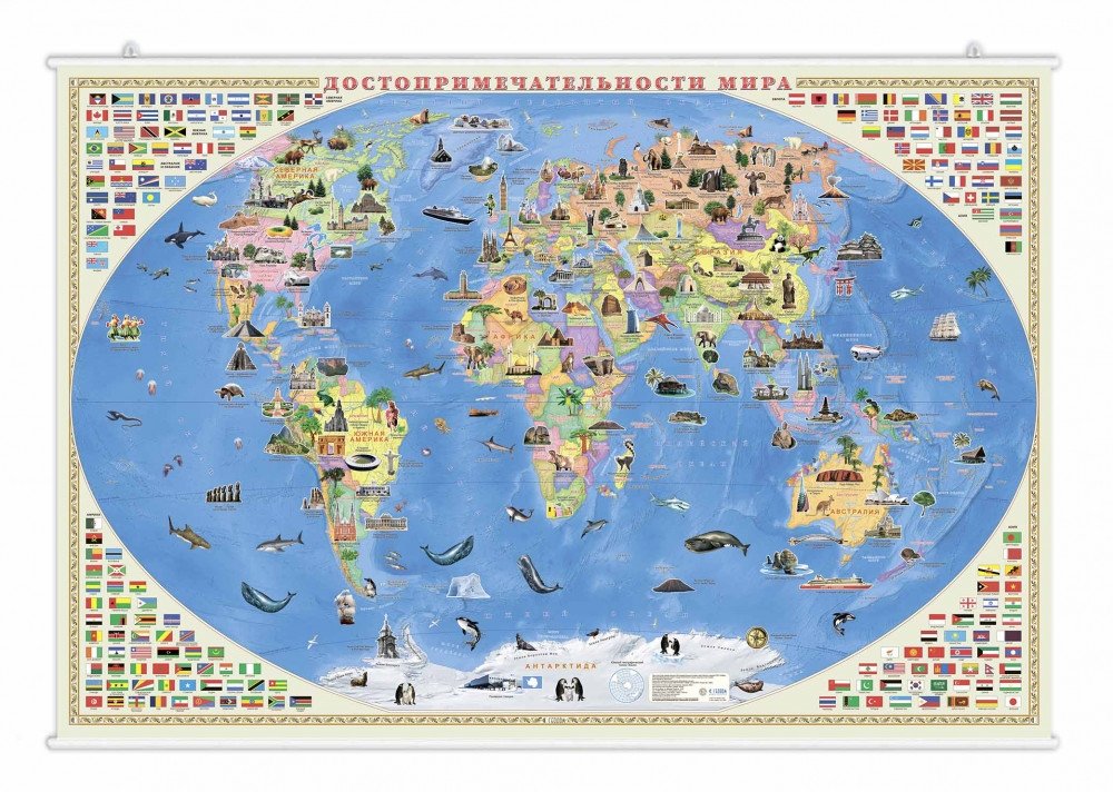 Как посмотреть все самые красивые и необычные достопримечательности из разных уголков мира не выходя из дома? С настенной картой «Достопримечательности мира» от издательства «ГЕОДОМ» вы сможете познакомиться с культурным и историческим наследием разных стран, изучить их государственные флаги. На карте также показаны представители животного мира, которые обитают на континентах нашей планеты. У карты оптимальный размер 101х69 см., а то что она закреплена на рейках, значительно упрощает размещение карты на стене. От повреждений и выцветания карта защищена ламинацией.