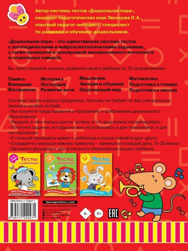 В этой системе проверки знаний, увлекательные вопросы и творческие задания объединены с логопедическими и нейропсихологическими упражнениями, а также проверкой и тренировкой эмоционального интеллекта и социальных навыков. Наклейки увлекают и мотивируют ребёнка к занятиям. В конце книги есть специальный сертификат, который можно подписать и вручить ребёнку, как официальную награду за хорошо проделанную работу.
