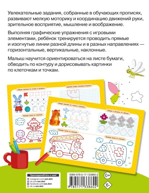 Замечательное развивающее пособие «Готовим руку к письму: рисуем по клеточкам и точкам. Обучающие прописи для самых маленьких» поможет ребёнку развить мелкую моторику, графические навыки, внимание и пространственное мышление. Плотная белая бумага позволит использовать цветные карандаши, мелки и фломастеры, а яркие иллюстрации сделают подготовку руки к письму интересной и увлекательной.