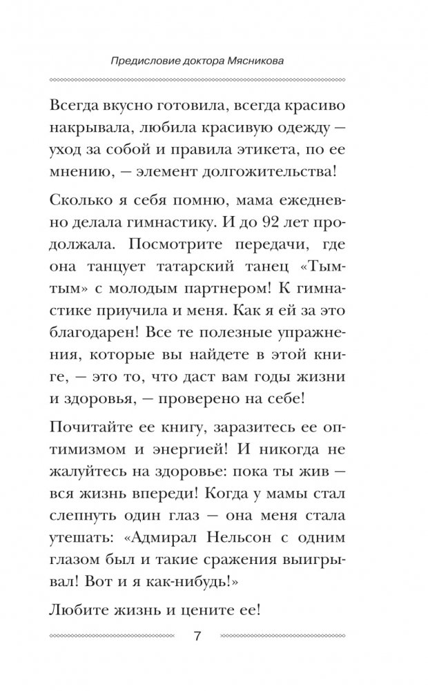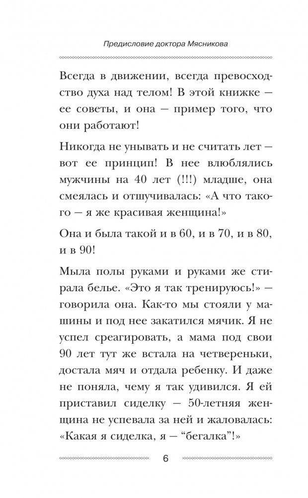 Открыть в себе новые способности, возможности тела и интерес к жизни можно в любом возрасте! Врач-геронтолог с 58 летним стажем работы Ольга Мясникова не раз говорила, что в 50 лет жизнь только начинается. Главное то, как вы себя настроите, как будете взаимодействовать с окружающим миром. В этой книге собраны упражнения, которые подойдут каждому! Вы сможете вернуть подвижность суставов и укрепить мышцы, восстановить тонус и бодрость. Так же в книге собраны простые и эффективные советы по уходу за собой и питанию, которые помгут чувствовать себя лучше, бодрее и уверенее! Главное- захотеть жить активно и счастливо!