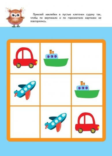 Лист с многоразовыми наклейками, необходимыми для выполнения некоторых заданий, находится в середине книги.