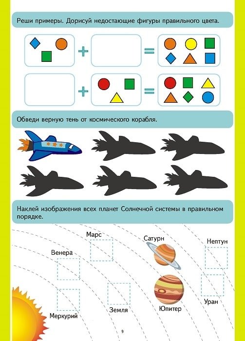 Дети не только познакомятся с планетами Солнечной системы и существующими и выдуманными космическими кораблями, но и научатся рисовать, решать задачки, проходить лабиринты, отгадывать головоломки, создавать картины с помощью пиксельных наклеек и в легкой игровой форме познакомятся с цифрами и буквами.