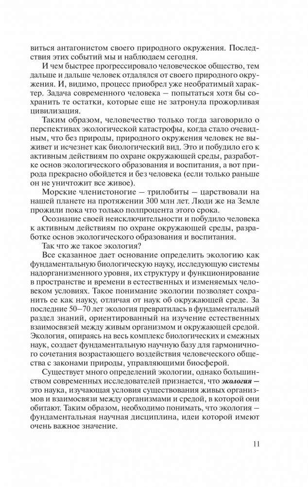 Изложены основы современных представлений об общей экологии. Рассмотрены предмет и методы экологии, факториальная экология, различные среды обитания, экосистема, разнообразие экологических сообществ, распространение организмов, их взаимодействия и взаимозависимости, принципы регуляции численности. Материал подан последовательно – от общих рассуждений к конкретным экологическим понятиям и законам и дальше к применению этих законов в повседневной деятельности. Учебник насыщен современными научными материалами и многочисленными примерами.