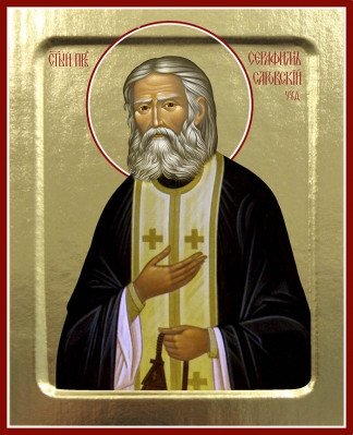 Икона преподобного Серафима Саровского на дереве. Техника изготовления: заготовка из липовой доски обрабатывается вручную, глубина ковчега 1,5-2,0 мм. После нанесения подготовительного грунта заготовка покрывается поталью (имитация сусального золота). Изображение иконы наносится современной светоотражаемой пигментной краской и защищается лаковым покрытием.
