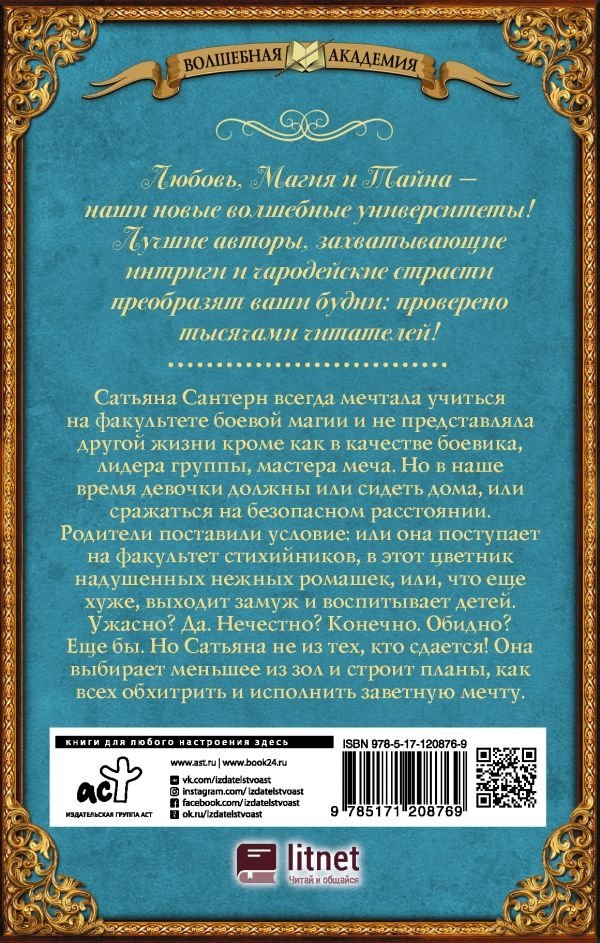 Сатьяна Сантерн всегда мечтала учиться на факультете боевой магии и не представляла другой жизни кроме как в качестве боевика, лидера группы, мастера меча. Но в наше время девочки должны или сидеть дома, или сражаться на безопасном расстоянии. Родители поставили условие: или она поступает на факультет стихийников, в этот цветник надушенных нежных ромашек, или, что еще хуже, выходит замуж и воспитывает детей. Ужасно? Да. Нечестно? Конечно. Обидно? Еще бы. Но Сатьяна не из тех, кто сдается! Она выбирает меньшее из зол и строит планы, как всех обхитрить и исполнить заветную мечту.